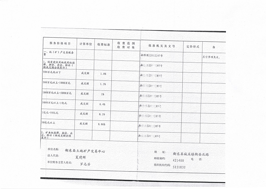 2012年衡東縣國土資源局地礦業(yè)務收費標準