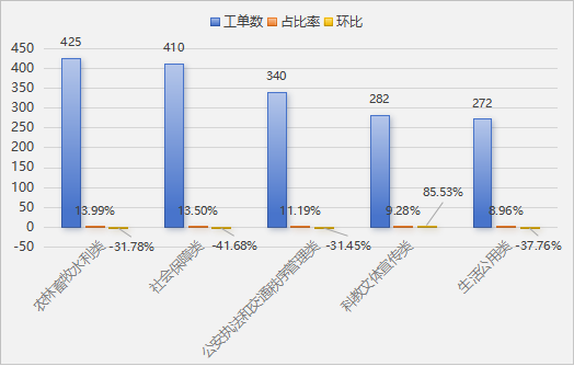 (三)訴求內容分析。2月,群眾來電訴求主要集中在:農林畜牧水利類425件,占訴求量的13.99%;社會保障類410件,占訴求量的13.5%;公安執法和交通秩序管理類340件,占訴求量的11.19%;科教文體宣傳類282件,占訴求量的9.28%;生活公用類272件,占訴求量的8.96%。與上月數據相比,本月科教文體宣傳類環比增長85.53%,公安執法和交通秩序管理類環比減少31.45%,農林畜牧水利類環比減少31.78%,生活公用類環比減少37.76%,社會保障類環比減少41.68%。