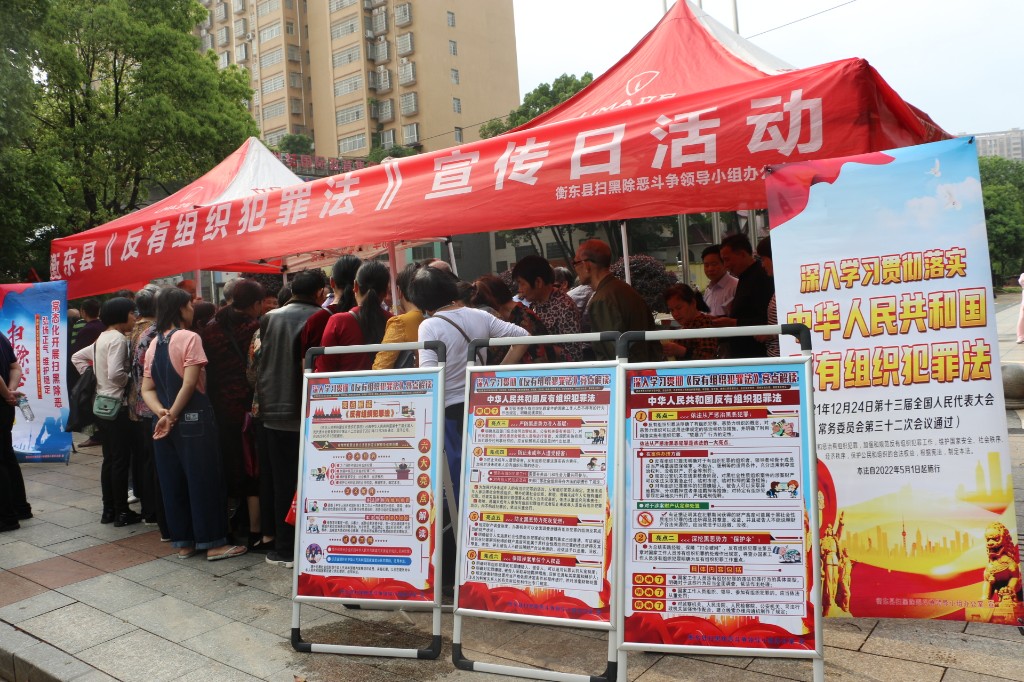 (通訊員:李煜劍)為深入貫徹實施《中華人民共和國反有組織犯罪法》,預防和懲治有組織犯罪活動,鞏固掃黑除惡專項斗爭成果,努力讓人民群眾在每一起掃黑除惡案件中感受到公平正義。4月26日,衡東縣縣委政法委組織縣法院、縣檢察院、縣公安局、縣司法局在衡東縣文體廣場開展《中華人民共和國反有組織犯罪法》宣傳活動,同時還進行了常態化掃黑除惡滿意度調查和現場接有組織犯罪線索舉報。