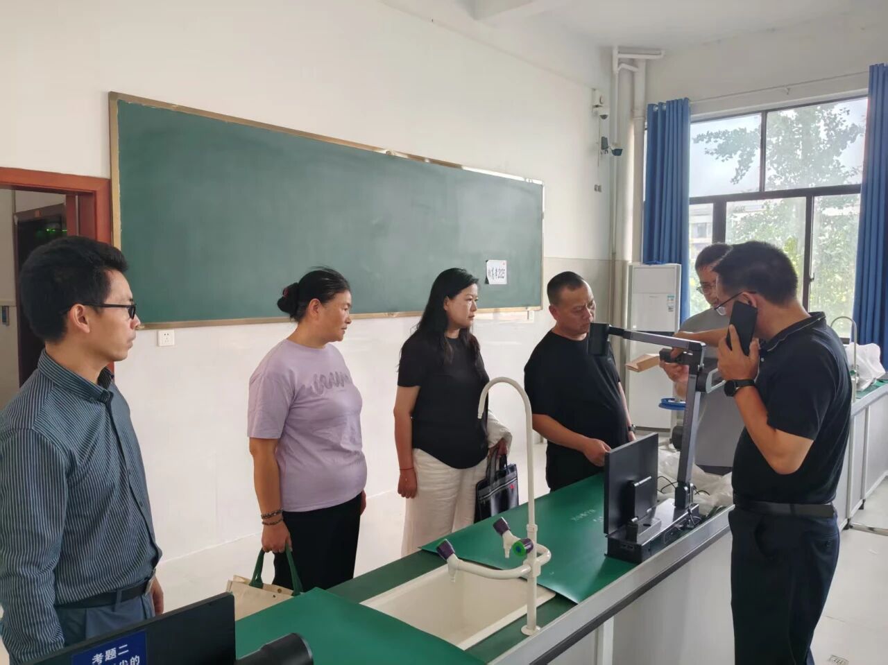 座談會后,調研組一行深入縣楊山實驗學校進行實地調研。在電腦教室,調研組仔細考察了設備性能、網絡架構以及教學應用場景,對教室配備的智能環境控制系統、互動教學平臺等創新設計給予高度評價。在生物實驗操作考室,調研組重點檢查了實驗考試終端設備性能、考試數據安全性以及AI智能評分的考試成績準確率等細節,認為該考室在功能分區、流程設計、安全防護等方面均已達到省級示范標準。