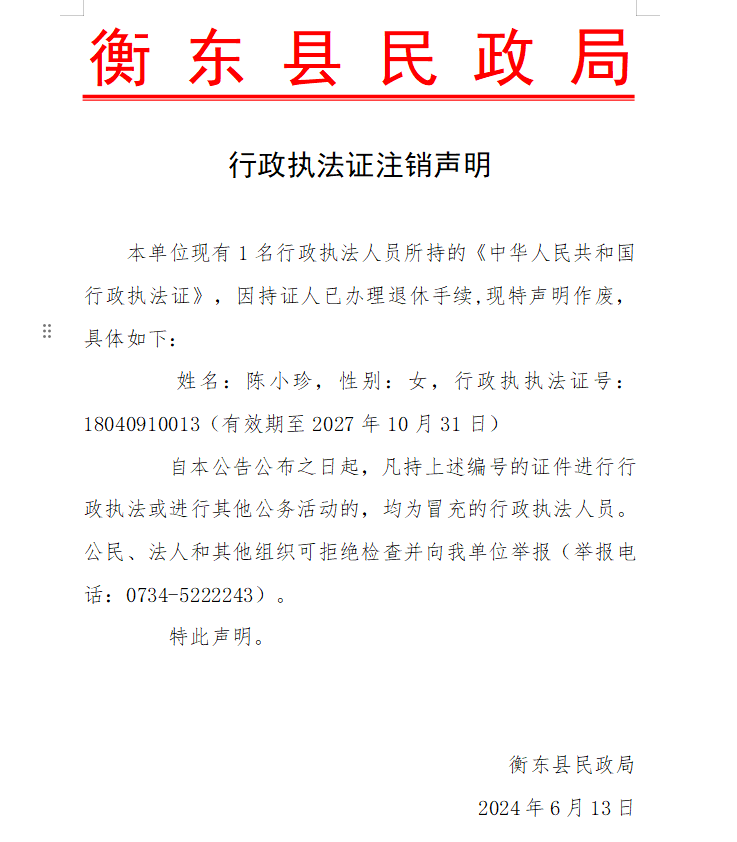 行政執法證注銷聲明